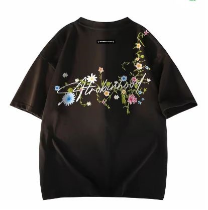 A black oversized tee featuring delicate, trailing floral embroidery or print.